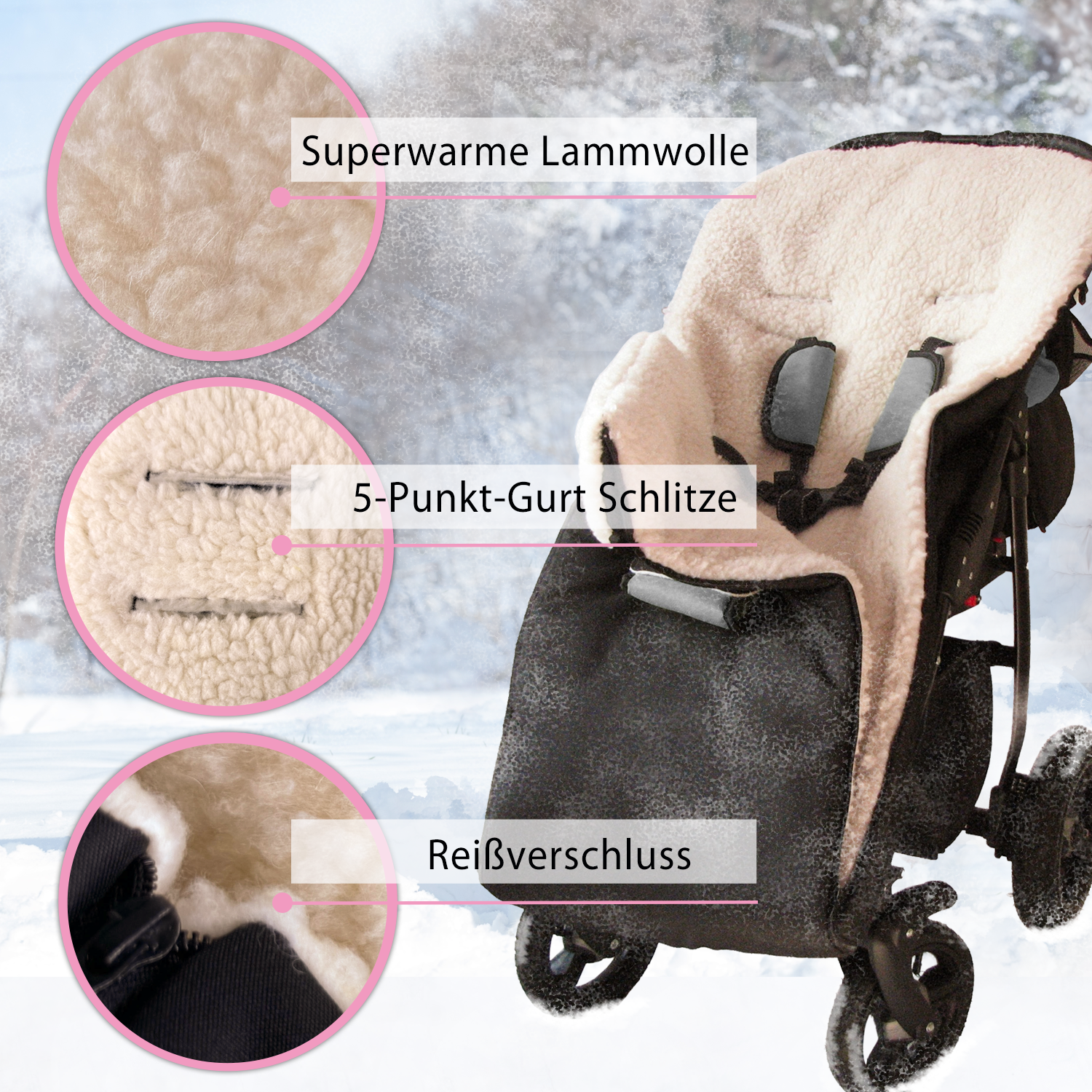 • 5-PUNKT-GURT-SCHLITZE | Passend für Kinderwagen, Buggy, Schlitten und Co., sicher, stabil und komfortabel nutzbar.