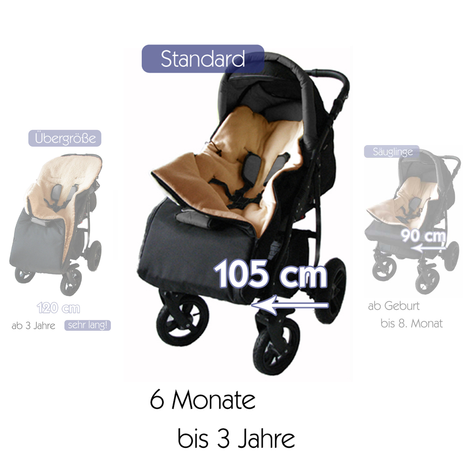 Bitte messen Sie Ihren Kinderwagen sorgfältig und schätzen Sie nicht. Bei den meisten Kinderwagen reicht die Größe 105 cm aus.