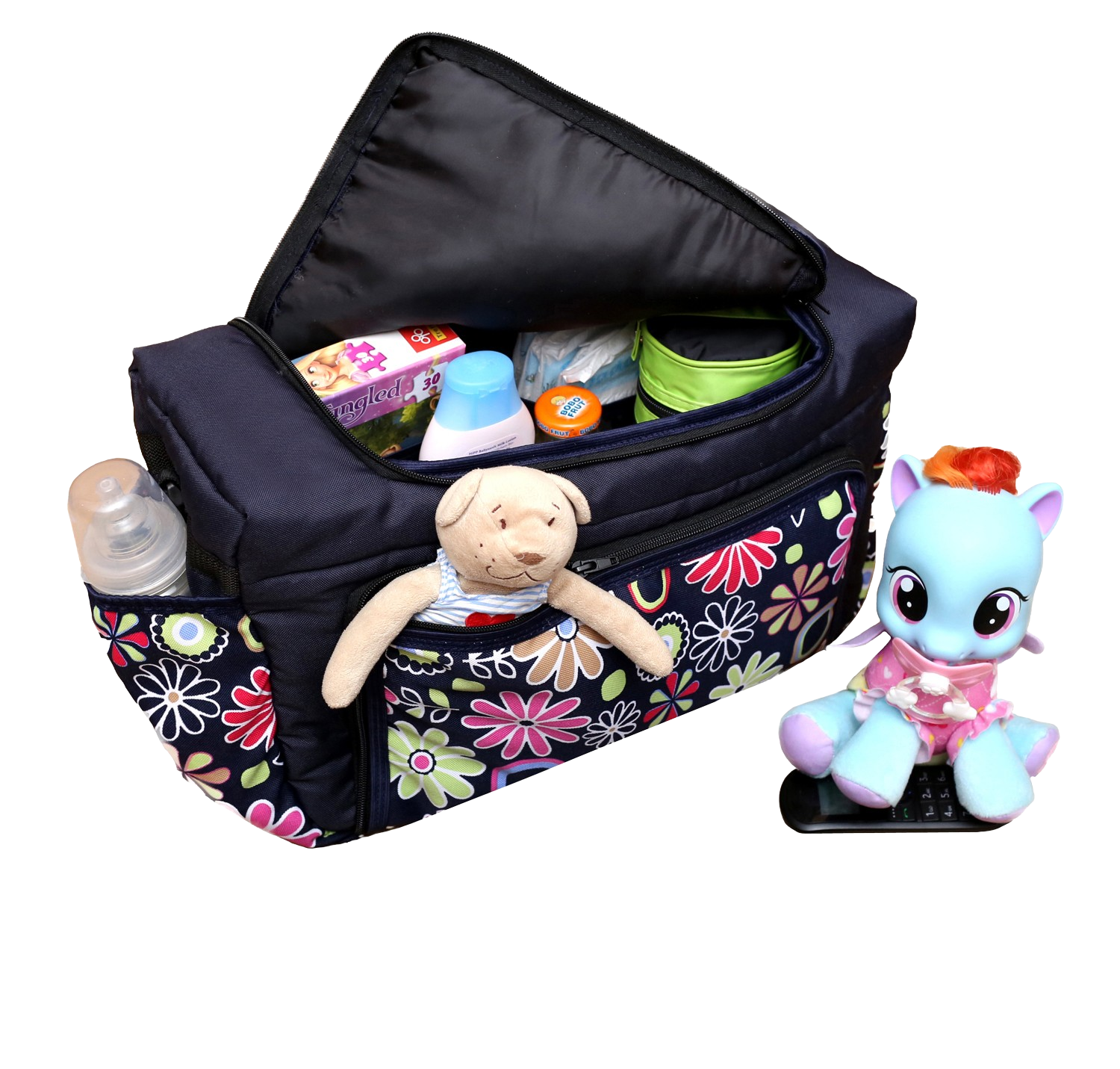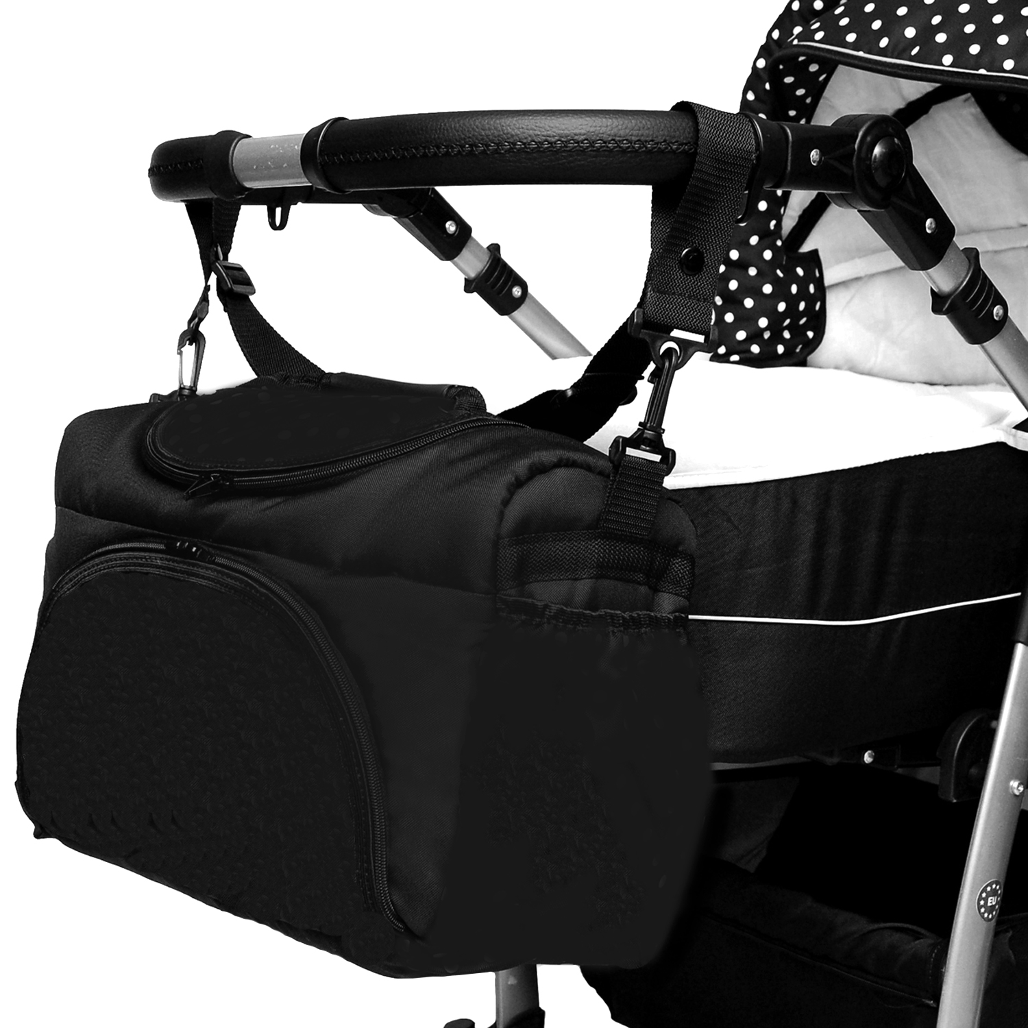 Die Wickeltasche ist praktisch an jedem Schiebegriff eines Kinderwagens zu befestigen. Die Haken und Druckknöpfe ermöglichen ein einfaches Anbringen. Sie kann aber auch ganz bequem als Umhängetasche über der Schulter getragen werden. Und das Wichtigste: Sie haben immer alles Nötige für Ihr Kind griffbereit! Innen ist genug Platz für Windeln und Wickelzeug, Wechselkleidung, Flaschen, Gläschen und dann sogar noch für Spielsachen! Im Inneren befinden sich mehrere Unterteilungen sowie Gummihalterungen mit denen man Behälter und Flaschen sicher und aufrecht transportieren kann. Der stabile Boden und die eingenähten Taschen/Unterteilungen ermöglichen einen problemlosen aufrechten Transport auch von größere Flaschen oder Behältern. Wer sich täglich viel Stress und langes Suchen ersparen will verwendet die super geräumige Wickeltasche von Baby-Joy! Wickeltasche in modernem Design, passend zu fast jedem Kinderwagen.